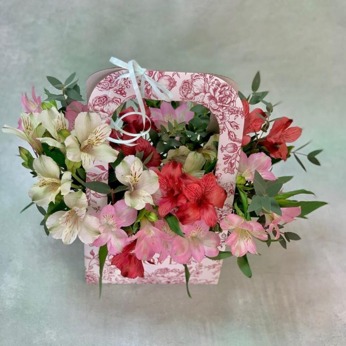Альстромерия – 8 шт.Эвкалипт – 2 шт.Оазис флористический – 1 шт.Сумка картон – 1 шт.