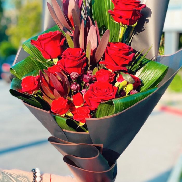 троянда червона – 7 шт. троянда спрей – 3 шт. леукадетрон – 3 шт. аспідістра – 10 шт. фенікс – 1 шт. оформлення букета – 1 шт.