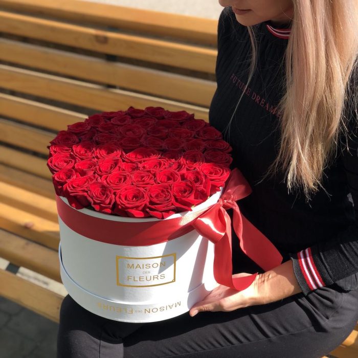 Прекрасная классическая композиция из Красных роз в белой фирменной Коробке, перевязанная шелковой лентой.