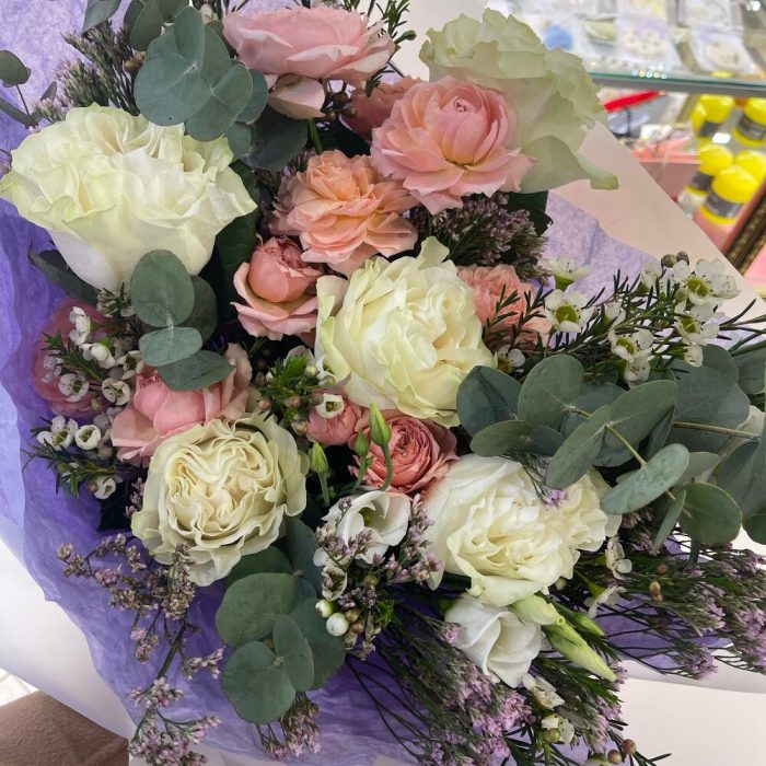 Роза Мондиаль – 5 шт.кустовая роза джульетта – 3 шт.Лимониум – 3 шт.Ваксфлауэр – 3 шт.Эвкалипт – 4 шт.Лизиантус – 1 шт.Упаковка дизайнерская – 2 шт.