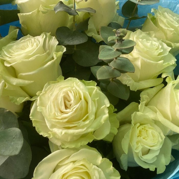 Эвкалипт – 2 шт.Роза – 11 шт.Лента атласная – 1 шт.Упаковка дизайнерская – 1 шт.