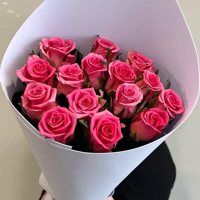 Роза – 15 шт.Лента атласная – 1 шт.Упаковка дизайнерская – 1 шт.