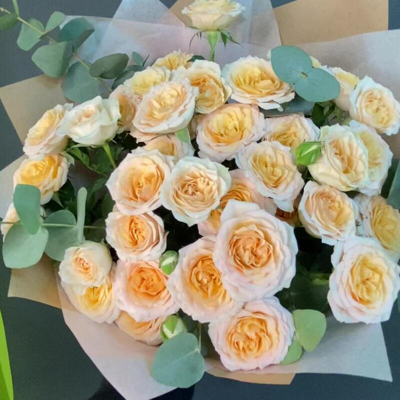Роза кустовая – 5 шт.Крафт дизайнерский – 4 шт.Эвкалипт ценария – 2 шт.