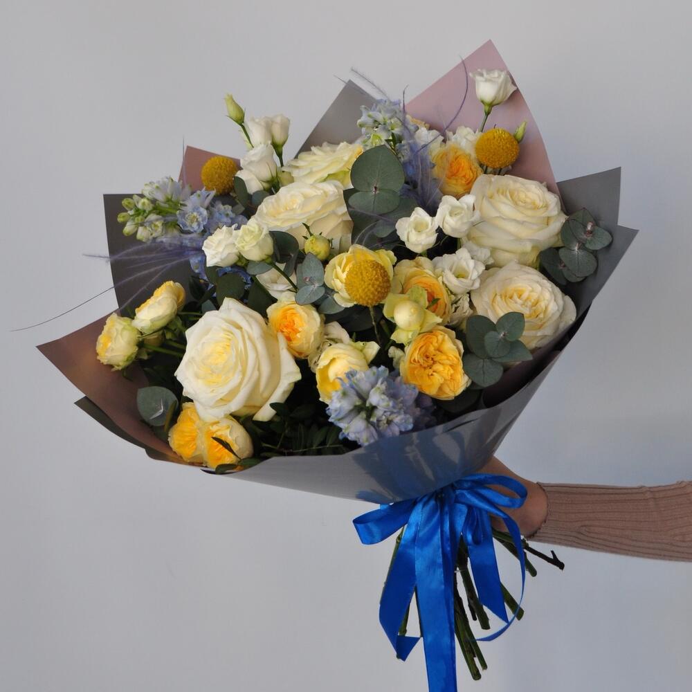 Дельфиниум – 3 шт.Краспедия – 3 шт.Эвкалипт – 2 шт.Эустома – 5 шт.Фисташка – 10 шт.Роза пионовидная – 5 шт.Роза кустовая пионовидная – 3 шт.Упаковка дизайнерская – 2 шт.