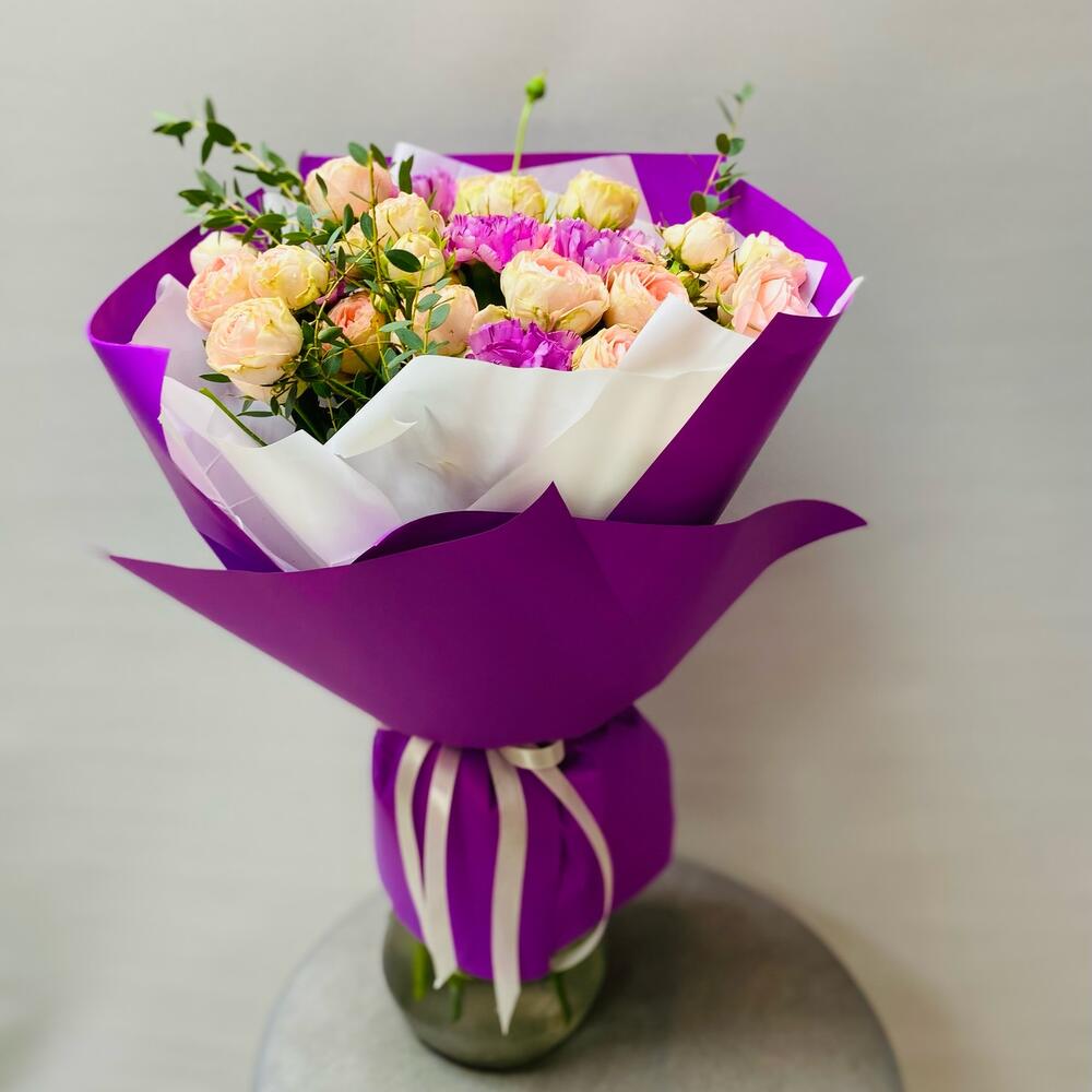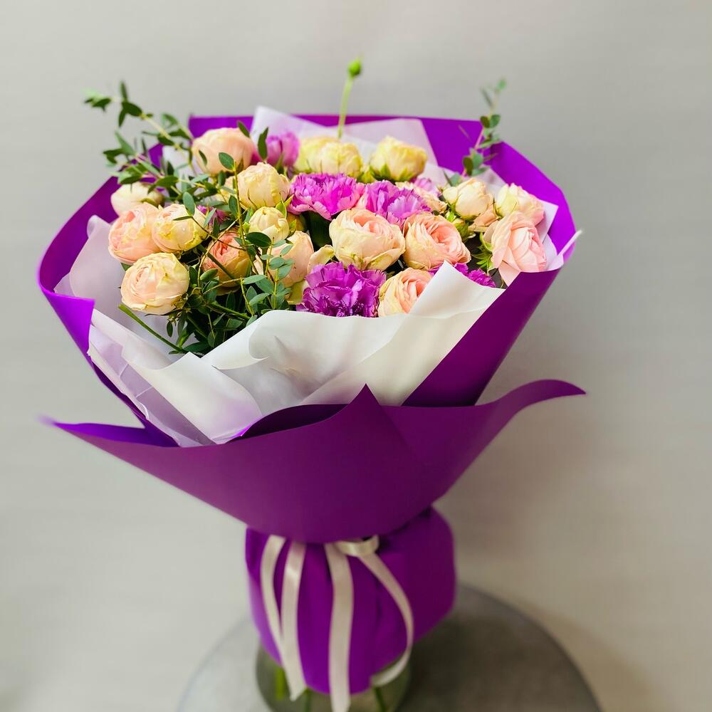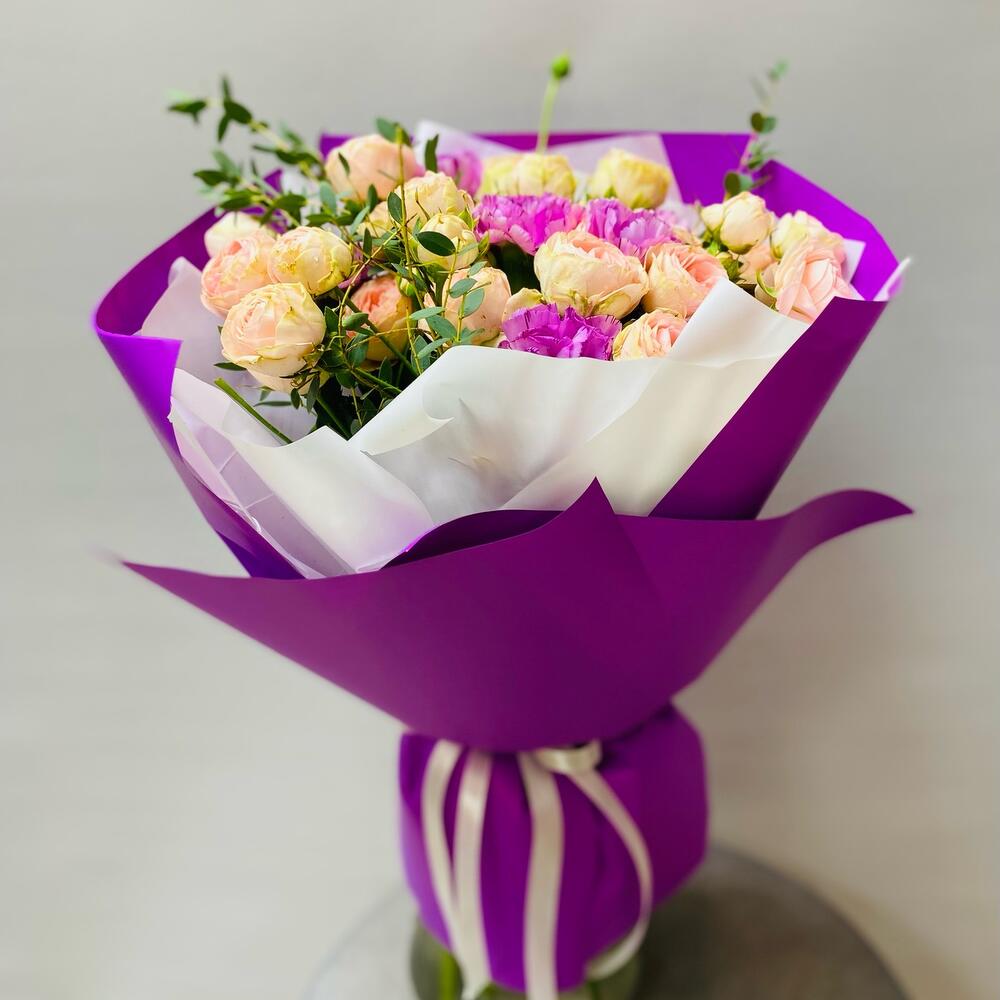 Роза кустовая – 5 шт.Диантус – 7 шт.Эвкалипт – 3 шт.Упаковка дизайнерская – 2 шт.